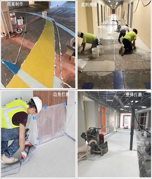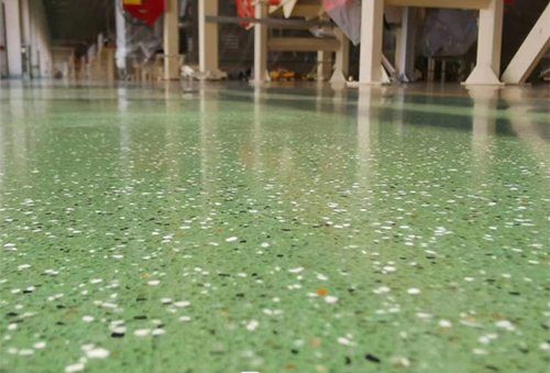 以无溶剂环氧树脂为胶凝材料,混合玻璃、贝壳、彩石、石英等骨料经过搅拌摊铺、研磨等工序制作而成的一种新型磨石地坪,极大的解决了传统水泥基类磨石因热胀冷缩可能带来的开裂问题;
