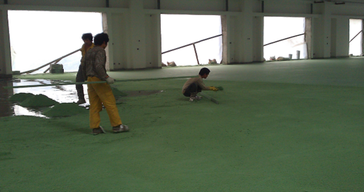 1.采用研磨机和抛丸机将基层混凝土表面浮浆层全部祛除,让基层露出骨料,增加与基层的粘接面积。