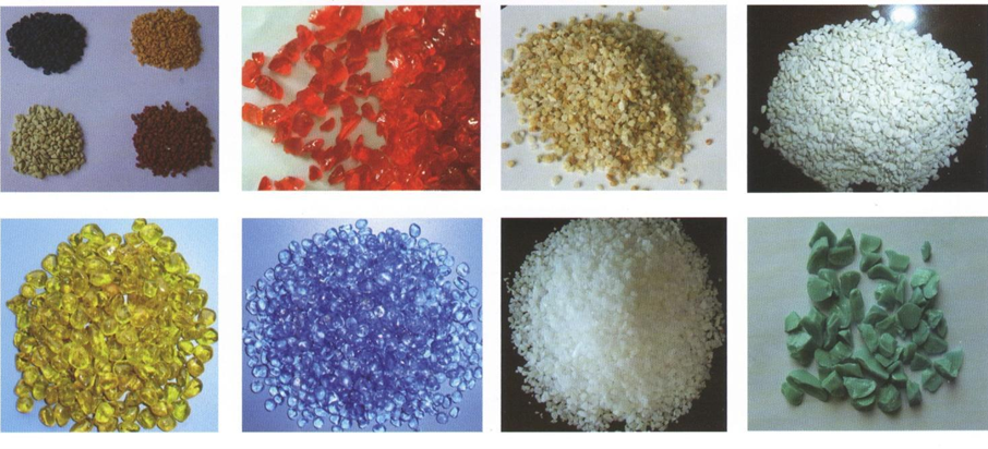 由不同目数的高透石英砂、玻璃、陶瓷颗粒、金属颗粒、反光镜片、天然贝壳、天然彩砂等硬质骨料,按科学配比进行集配混合而成,产品具有易施工、堆积密度大、强度高等特点。