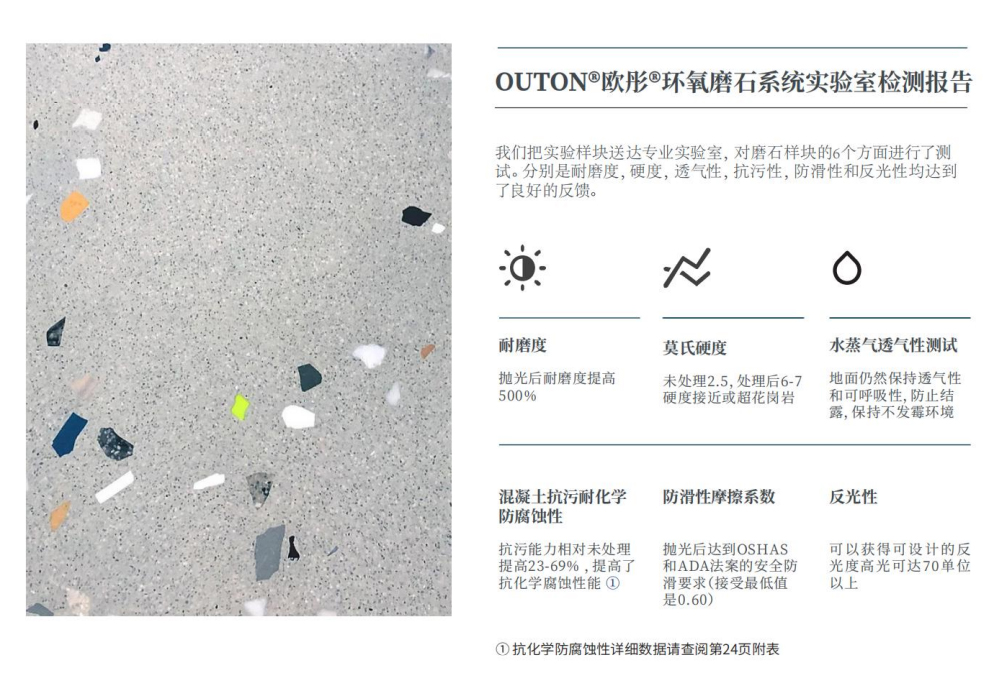 以无溶剂环保型环氧树脂为胶粘材料,混以石子、玻璃、石英等骨料经过搅拌、摊铺、研磨等工序制作而成的一种磨石地坪;作为一种新兴的磨石地坪体系,环氧磨石地坪几乎解决了传统水泥基磨石的所有缺陷,极大的丰富了磨石地面的内涵,在带来最大设计自由度的同时,也带来了始终如一的安全稳定,作为一种新兴的高端磨石地面系统,为越来越多的客户所认知和选择。市场上较多出现的很多新型磨石地面概念大部分本质为环氧磨石地面体系。